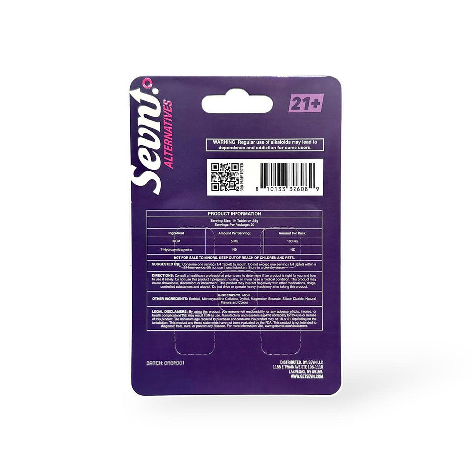 Sevn Alternatives MGM Rapid-Release Tablets – Grape Wrath are crafted for users seeking fast-acting performance and precise dosing in a convenient tablet format. Each tablet delivers 20mg of kratom extract, formulated for rapid release and consistent effects without the need for powders or preparation.